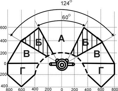 Участки В и Г образуют зоны вспомогательных движений. Для проведения манипуляции на участке В требуется движение всей руки и движение головой, а на участке Г – поворотом туловища с поворотом головы.