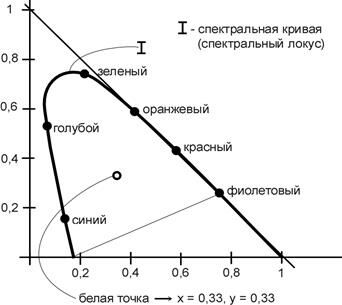 Для характеристики цвета также принята трехкомпонентная система. За основные цвета приняты красный, зеленый, синий. Любой цвет можно получить смешивая их в соответствующих пропорциях (колометрический треугольник).