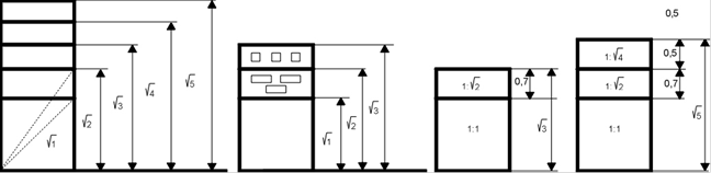 Широко распространены пропорции с применением иррациональных величин √2, √3, √5.