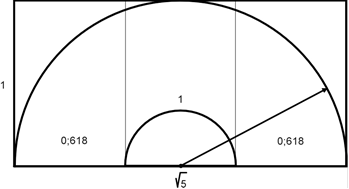 , связанный с “золотым сечением”. При членении этого прямоугольника полуокружностью получаются два прямоугольника “золотого сечения” 0,618:1 и квадрат, либо два прямоугольника 1:0,618 и 1:1,618.