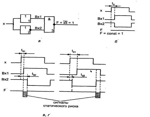 Рис.4.1. Статические риски сбоя в комбинационных схемах: а) схема, реализующая функции "константа 1", и временные диаграммы ее работы: б) при t31 = t32; в) при t31 < t32 ; в) при t31 > t32
