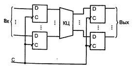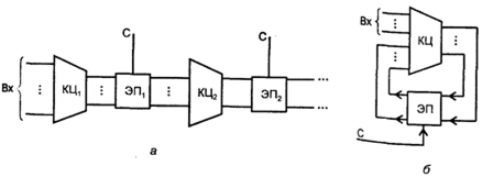 Обобщенный тракт обработки информации при синхронной организации процессов можно представить чередованием комбинационных схем и элементов памяти, что отражает работу ЦУ как при пространственном чередовании КС и ЭП (рис. 4.3, а), так и при последовательном выполнении различных операций в разных временных тактах на одном и том же оборудовании (рис. 4.3, б).