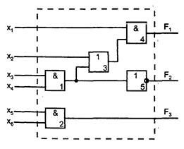 Для определения временного интервала, на котором проходят переходные процессы, следует оценить задержки на путях распространения сигналов от входов к выходам КС. Например, рассмотрим схему на рис. 4.2, в которой нужно выбрать пути с минимальной и максимальной задержками сигналов. Если на входе КС изменение сигналов произошло в нулевой момент времени, то по самому короткому пути до выхода F3 сигнал от входа Х5 или Х6 может пройти за время tксmin= tз2min . Это время и обозначит начало интервала переходных процессов. На самом длинном пути до выхода f1 сигнал от Х3 или Х4 задержится не более чем на время tксmaх= tз1max + tз3max + tз4max .