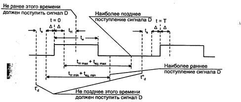 Чтобы соблюдалось требование неизменности информационного сигнала на интервале предустановки, входной сигнал триггера должен устанавливаться не позднее момента времени — (Δ + ts) для первого импульса и момента Т - Δ - ts для второго импульса. Изменение информационного сигнала становится допустимым не раньше момента времени Δ + tн для первого импульса и Т + Δ + tн для второго. Наиболее позднее появление входного информационного сигнала (максимальная задержка в КС и триггере) в интервале между импульсами происходит в момент Δ + tтг mах + tКС. мax, а наиболее раннее (минимальная задержка в КС и триггере) в момент — Δ + tтг min + tКС. мin.