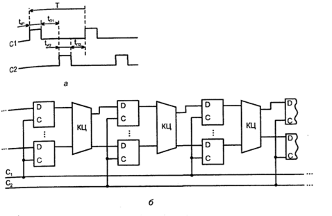Такая синхронизация характеризуется использованием двух последовательностей синхроимпульсов (рис. 4.7, а), сдвинутых во времени друг относительно друга. Интервал между импульсами обеих последовательностей отводится для работы комбинационных цепей. Соседние каскады получают разноименные серии синхроимпульсов (рис. 4.7, б).