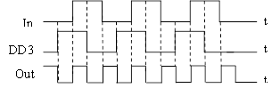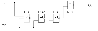 Задержка элемента 3 на рис. 4.1 для удобства рассмотрения переходных процессов в схеме считается равной нулю. На временных диаграммах переходных процессов видно, что при неодинаковых значениях задержек первого и второго элементов возникает статический 0-риск после положительного или отрицательного перепада входного сигнала в зависимости от того, задержка какого элемента больше.