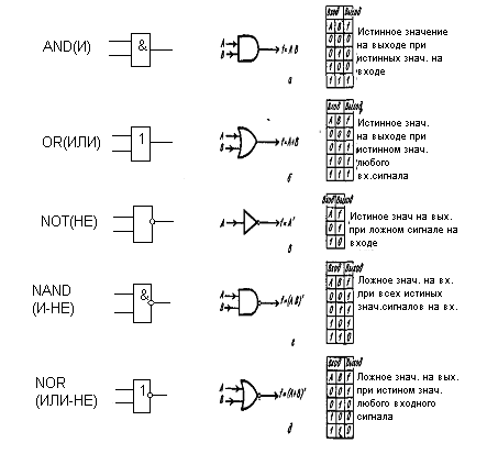 На рис 1.3. изображено слева – направо: название элемента (на английском и русском языках), европейское (отечественное) и американское графическое изображение элемента и его таблица истинности.