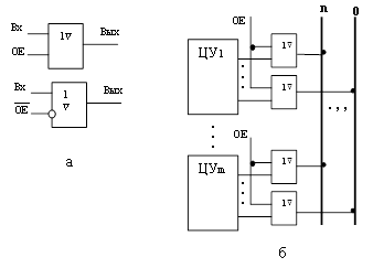 Рис.1.6. Организация передачи данных по общей шине: а) условное графическое обозначение трехстабильных элементов; б) схема подключения m устройств n - разрядной общей шине