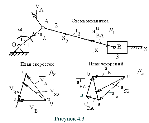 Рассмотрим построение планов скоростей и ускорений на примере кривошипно-ползунного механизма (рис. 4.3). Схема механизма должна быть изображена в масштабе
