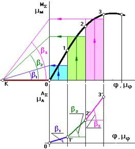 Суть метода: на продолжении оси абсцисс слева выбирается произвольный отрезок интегрирования ОК, чем он длиннее, тем более пологим будет график АΣ . Затем площадь под кривой М(φ1) на каждой итерации заменяется площадью равновеликого прямоугольника.
