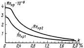 Зависимость критического числа Reкр от степени турбулентности потока k. ( Reкрl =-woxкрl/v - критическое число Re отвечающее переходу от ламинарного к переходному режиму течения, когда в пограничном слое возни- возникают первые вихри и пульсации; Reкp2 = woxкр2/v - критическое число Рейнольдса для перехода к развитому турбулентному режиму течения.) |