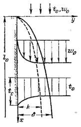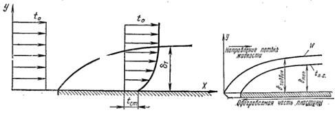 Если температуры стенки и жидкости неодинаковы, то вблизи стенки формируется тепловой пограничный слой, в котором происходит аналогичные изменение температуры жидкости. Вне пограничного слоя температура жидкости постоянна tо. В общем случае толщины тепловoгo и динамического слоев могут не совпадать. Соотношение толщин динамического и теплового пограничных слоев определяется величиной безразмерного числа Рг = n/a. Для вязких жидкостей с низкой теплопроводностью (например, масел) Рг>1 и толщина динамического пограничного слоя больше толщины теплового пограничного слоя. Для газов Рг≈1 и толщины слоев приблизительно одинаковы. Для жидких металлов Рг < 1 и тепловой пограничный слой проникает в область динамического невозмущенного потока.