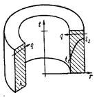 Рис. 1.10. Цилиндрическая однослойная стенка. Теплота передается от внешней поверхности к внутренней. | Стенка выполнена из однородного материала, коэффициент теплопроводности l которого известен и не зависит от температуры, внутренний и наружный радиусы трубы равны r1 и r2 , температуры внутренней и наружной поверхностей t1 и t2 не меняются во времени. Выделим в стенке трубы цилиндрическую поверхность радиусом r, площадь которой F = 2prL м2, где L — длина трубы. Количество теплоты Q, переданной через эту поверхность, можно определить по уравнению Фурье: Q=q*F=q*2prL= Рекомендуемые материалыТехническое задание FREE Маран Программная инженерия -34% ЛЮБАЯ практика в Синергии! -20% ЛЮБАЯ дипломная работа в Синергии! = -l*(dt/dr)* 2prL. Q должно равняться тому количеству, которое проходит через внутреннюю r = r1 и наружнюю r = r2 поверхности, которые одинаковы. 2 |