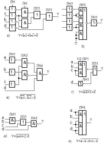 Пример. На логических микросхемах серии К155 (табл. 2.1) построить несколько вариантов схем, реализующих заданную минимальную ДНФ