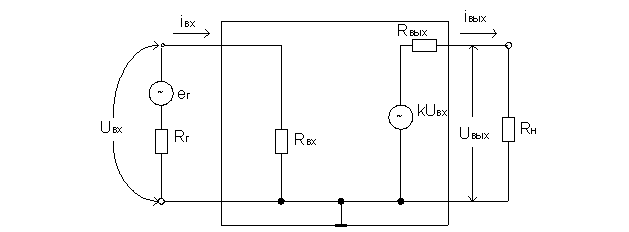 Любой усилитель со стороны входа может быть представлен как Rвх. Любой усилитель со стороны выхода может быть представлен либо в виде управляемого источника напряжения (kUвх), либо управляемого источника тока kiiвх, а также эквивалентного выходного сопротивления.