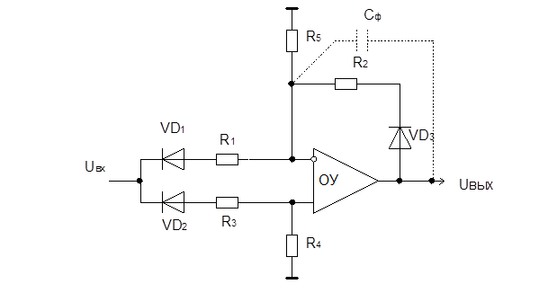 Диод VD3 в данной схеме выполняет функции компенсации нелинейности входного сопротивления диодов VD1 и VD2 при малых Uвх. Все диоды VD1 - VD3должны быть согласованы, чтобы не было погрешности при выпрямлении.