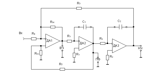 Внешними элементами являются конденсаторы С1 и С2. На выходе схемы ДА3 имеет место дважды проинтегрированный сигнал, т. е. выход фильтра ФНЧ. После ДА1 имеет место выход фильтра ФВЧ, т. к. на выход ДА1 имеет место сигнал, у которого из полного входного сигнала вычтены нижние частоты, следовательно, остаются только ВЧ. НА выходе ДА2 ослабляется ВЧ, следовательно, если R1C1 < R2C2 на выходе ДА2 остается полосовой сигнал или ПФ. Таким образом, в зависимости от использования выхода, эта схема выполняет функции ФНЧ, ФВЧ и ПФ, что позволяет на ее основе создавать различные фильтры.