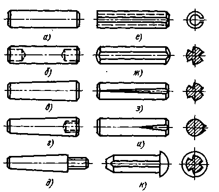 Основные виды конических штифтов: а) простые, забиваемые в отверстия, применяемые в сквозных отверстиях при возможности выбивания другой стороны; б) с резьбой для извлечения при разборке, применяемые при установки в глухие отверстия. В соединениях, подверженных толчкам и ударам, и в соединениях быстровращающихся деталей конические штифты необходимо специально предохранять от ослабления натяга и выпадания. Для этого их выполняют с прорезью.