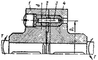 Другим представителем предохранительных муфт является муфта со специальным разрушающимся элементом (рис 1). Здесь крутящий момент между полумуфтами 1 и 4 передается через штифт 3, который срезается при перегрузке. Для восстановления работы муфты штифт заменяют. Закаленные втулки 2 облегчают замену штифтов, предотвращают смятие более слабого материала полумуфт штифтом и тем самым приближают действительные условия среза штифта к расчетным:
