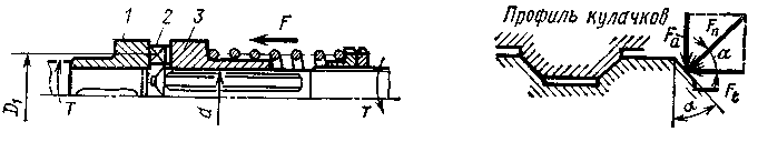 В соответствии с силой F подбирают пружину. Прочность кулачков рассчитывают так же, как и в обычных кулачковых муфтах: