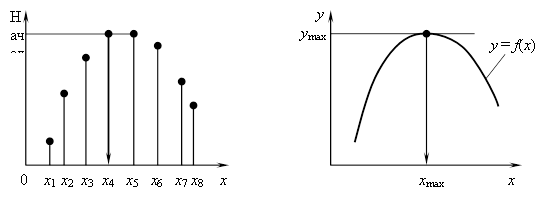 На рис. 1.1. а) показан эмпирический (экспериментальный) подход к решению поставленной задачи, который состоит в экспериментальном определении значения параметра у для нескольких значений входного воздействия х. Среди них найдено наибольшее, и оно принимается за максимум. Как видим из этого рисунка, возможно несколько значений воздействия х (х4 и х5), при которых у имеет наибольшее значение, но ни одно из них не является настоящим максимумом, который, возможно, лежит между ними.