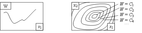 Наглядно можно представить себе только одномерную и двухмерную поверхности отклика, причем в последнем случае удобно пользоваться топографическим способом изображения рельефа поверхности с помощью линий уровня (изолиний), построенных в двумерном факторном пространстве Х. (Рис. 1.4).