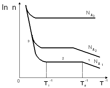 Температурную зависимость концентрации свободных носителей заряда, изображенную на рис. 4.9, рассмотрим на примере полупроводника n-типа. Зависимость в общем виде имеет три участка: 1– примесной проводимости; 2– истощения примеси; 3 – собственной проводимости.