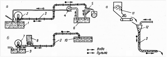 Рис. 21.1. Схемы гидротранспортных установок: а – с пульпонасосом;