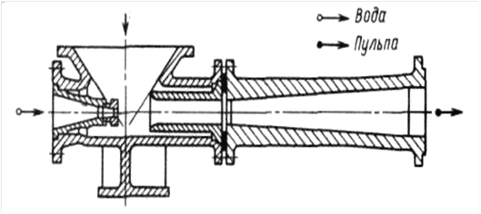 Эжекторное устройство (струйный аппарат) установки работает следующим образом: струя воды под давлением с большой скоростью выходит из кони­ческого сопла и, образуя вокруг себя разреженное пространство, засасывает шлак и золу из воронок. Смешение во­ды и груза и образование пульпы про­исходит в сменном патрубке, примы­кающем к конической трубе, – диффузо­ре, в котором кинетическая энергия струи снова превращается в потенциаль­ную энергию давления, служащую для дальнейшего транспортирования пуль­пы по пульпопроводу.