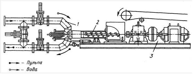Бескамерный винтовой питатель не­прерывного действия (рис. 21.3) состоит из трех узлов: привода 3 (двигатель, турбомуфта и редуктор), винта 2 в ци­линдрическом кожухе, входящего с одной стороны в приемную воронку, и трубопровода 1, примыкающего к свободному от винта цилиндрическо­му патрубку и образующего в этом ме­сте смесительную камеру. Трубопровод снабжен задвижками, которые могут перекрывать его или перепускать воду для промывки в обход смесительной камеры.