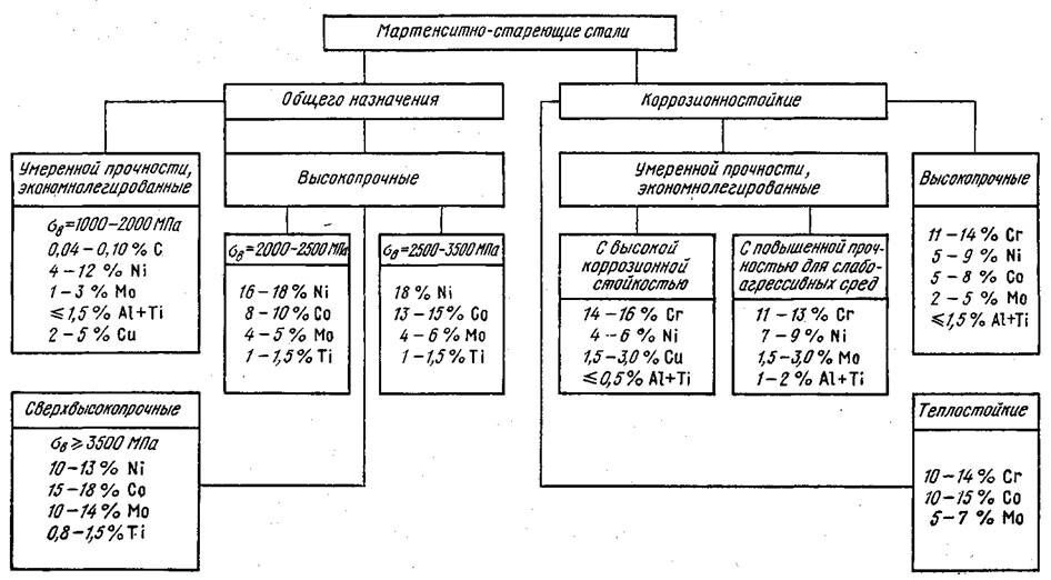 В сверхвысокопрочных сталях содержание кобальта доходит до 15–18 %, а молибдена до 10–14 %. Схема классификации мартенситностареющих сталей приведена на рисунке 3.13.