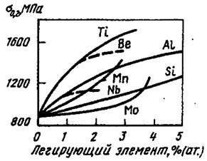 Для того, чтобы обеспечить упрочнение при старении, в мартенситностареющие стали вводят элементы, участвующие в образовании дисперсных интерметаллидов. Легирующие элементы по уменьшению эффекта упрочняющего влияния располагаются в следующем порядке: Ti, Be, Al, W, Mo, Cu, при этом изменение прочностных свойств при увеличении содержания легирующего элемента, как правило немонотонно (рисунок 3.14).