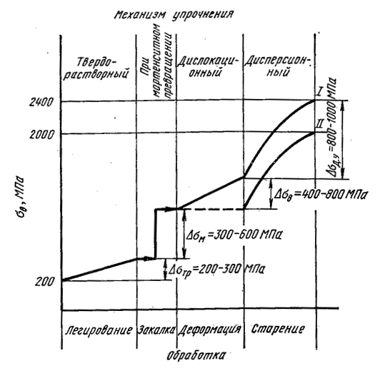 Рисунок 3.15 – Схема вклада различных механизмов упрочнения в прочность мартенситностареющих сталей (М.Д. Перкас, С.В. Грачев)