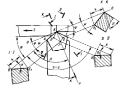 Переходную режущую кромку выполняют или по радиусу или в виде фаски под углом jо= j/2 и длиной f =0,5—3,0 мм в зависимости от размеров резца, Задний угол на переходной кромке aо = a.