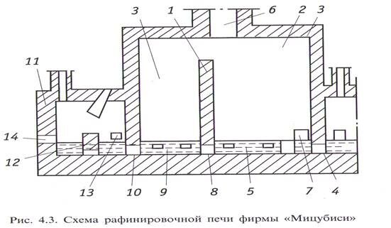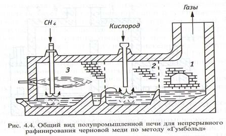 В зоне 1 плавят черновую медь (80% массы шихты), и анодный скрап (20%), твердые слитки металла загружают через отверстие в боковой стене печи, а расплав заливают через отверстие в торцевой ее части. Далее жидкая медь переливается через порог и поступает в зону окисления 2, где ее продувают кислородом со сверхзвуковой скоростью. Окисленный расплав (1.5% О2) через отверстие в перегородке перетекает в зону восстановления, где его обрабатывают пропаном или природным газом с помощью вертикальных фурм. Восстановленную медь удаляют из зоны носстановления под перегородкой в торце печи, а шлак - из зоны окисления через окно в боковой стене.