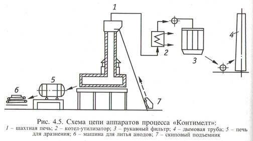 Вопрос 3. Процесс «Контимелт». Для плавки и непрерывного рафинирования черновой меди и переработки вторичного сырья разработан процесс «Contimelt» с использованием комплекса шахтной и отражательной печей (рис. 4.5).
