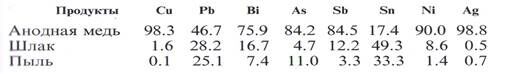 При переработке черновой меди состава, %, мае: Сu- 97.5; Рb—0.15; Bi-0.058; As-0.093; Sb-0.078; Sn-0.158; Ni- 0.253; Ag-0.074 с α=1.0 получено следующее распределение компонентов, % по продуктам рафинирования.