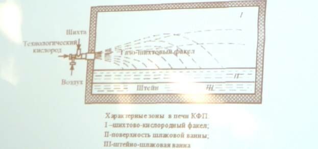 Суть процесса во вдувании тонкодисперсного, подсушенного концентрата током воздуха или технологического кислорода, кислородно-воздушная смесь (КВС), в предварительно разогретое пространство печи. Флюсы и концентрат имеют размер частиц от 0,01-0,1мм. Таким образом, частицы обладают реакционно-развитой поверхностью контакта фаз. Поэтому они моментально воспламеняются, окисляются и плавятся за счет экзотермической теплоты. Поэтому из шихтового факела на поверхность отстойной зоны печи капают капли расплава, которые, собираясь, образуют слой жидкой ванны. В процессе отстаивания происходит разделение фаз. Внизу более плотный штейн, вверху легкий шлак. В процессе сжигания сульфидов образуется кислородно-шихтовый факел. Слева установлены рабочие кислородно-шихтовые горелки для получения штейна и шлака, а справа, такие же по конструкции для обеднения шлака. С целью обеднения в них подают перит.