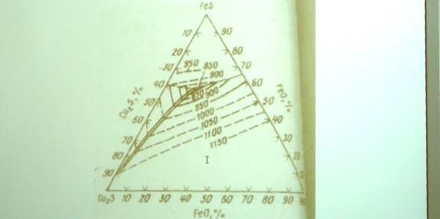 Оксисульфидная система FeS-FeO, которая является основой, (матрицей), гомогенного жидкого расплава представляет основу жидкости, в которой растворяются тугоплавкие нерудные оксиды СaOAl2O3 MgO. Оксисульфидная система FeS-FeO характеризуется широкой областью гомогенности, соответственно диаграммы состояния FeS-FeO по мере растворения в расплаве псевдо двойной системе FeS-FeO нерудных оксидов происходит разрыв гомогенности в системе [Cu2S-Cu2O-FeS-FeO-Fe3O4]. За счет протекания реакций по схеме 2= [Cu2S-Cu2O-FeS-FeO-Fe3O4]+(CaO+Al2O3-MgO)= [Cu2s-Fes-Fe3O4]штейн +(FeO-Fe3O4-Cu2O-SiO2-CaO-Al2O3-MgO)шлак.