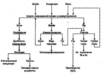 рата на богатый штейн с последующей его доработкой до черновой меди; охлаждение и флотационное обеднение шлака; очистку газа от пыли и производство серной кислоты.