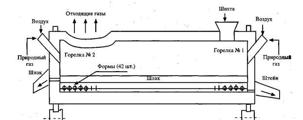 Шлак с поверхности расплава удаляют непрерывно с торцевой части печи, противоположной загрузке, и далее по футерованному желобу поступает непосредственно в изложницы.