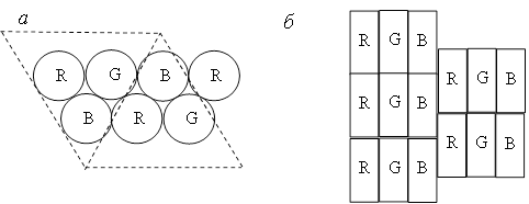 При пространственном сложении цветов происходит слитное восприятие разноцветных штрихов, точек, полосок или других цветных элементов, угловые размеры которых меньше угла, разрешаемого глазом. Могут быть два варианта пространственного сложения. Первый вариант, когда цвет смеси определяется соотношением площадей, занятых элементами каждого цвета постоянной интенсивности. Он, в частности, используется в полиграфии и на различного рода физкультурных мероприятиях, когда участники по команде поднимают один из трёх имеющихся у них флажков с соответствующим цветом R, G или В. Механизм такого сложения цветов объясняется ограниченной разрешающей способностью зрения в пространстве. Второй вариант, когда число и площадь разноцветных элементов одинаково, а результирующий цвет определяется интенсивностью (яркостью) элементов каждого цвета. Этот вариант используется при построении цветного кинескопа. Экран цветного кинескопа имеет мозаичную структуру, состоящую из маленьких точек – люминофоров разного химического состава и группирующихся тройками (триадами). При возбуждении люминофорных точек электронными лучами они светятся соответствующим красным, зеленым и синим цветом различной интенсивности. На практике получили распространение два типа кинескопов, отличающихся расположением разноцветных люминофоров: дельта-кинескоп (рисунок 4.2, а) и компланарный (рисунок 4.2, б).
