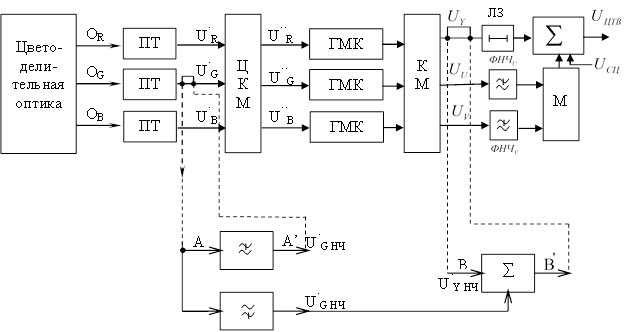 - передающие трубки (ПТ), создающие электрические сигналы, соответствующие цветоделенным изображениям (