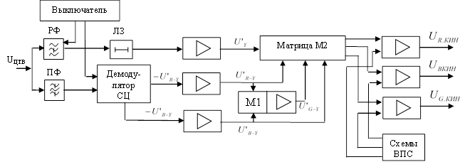 Выделенный СЦ подается на демодулятор. На выходе демодулятора образуются сигналы – UR-Y, и – UB-Y, которые усиливаются и подаются на матрицу (М1) для формирования сигнала UG-Y в соответствии с (4.8). Полученные сигнал яркости и три цветоразностных сигнала можно подавать на кинескоп или непосредственно, или после преобразования в сигналы основных цветов.