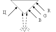 , см. далее подраздел 4.3). Она осуществляется на основе колориметрии - области науки о цвете и цветовых измерениях. В свою очередь, колориметрия базируется на экспериментах, в первую очередь на опытах по зрительному уравновешиванию измеряемого цвета с цветом, полученных сложением основных цветов. Суть опыта следует из рисунка 4.4, где на левую грань призмы, сделанной из непрозрачного белого материала, подаётся измеряемый цвет, а на правую грань - синтезированный цвет, полученный сложением в определённых пропорциях трёх основных цветов R, G и В.