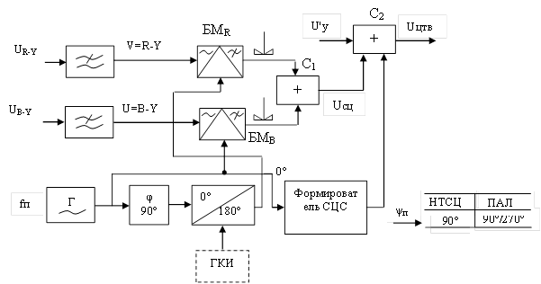 В системе НТСЦ сигнал цветности представляет собой напряжение поднесущей частоты, модулированное по амплитуде одновременно двумя цветоразностными сигналами. Для его получения (рисунок 5.1) два сигнала UR-Y и UB-Y ограничиваются по полосе с помощью ФНЧ примерно до 1,5 МГц и поступают на балансные модуляторы (БМ), на которые от кварцевого генератора (G) подается напряжение поднесущей частоты fп: на один БМ (БМB) непосредственно, а на второй (БМR) – со сдвигом по фазе на 90°. Балансные модуляторы работают как перемножители входных сигналов. Сигналы с выходов БМ суммируются в сумматоре С1 и полученный сигнал цветности складывается с сигналом яркости (в сумматоре С2). Частота поднесущей fп выбрана равной нечетно кратной гармонике полустрочной частоты: fп=(2m+1)fстр/2=(m+0,5)fстр. В стандарте США fп≈3,5 МГц (в европейском варианте 4,4 МГц).