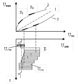 . При нелинейной зависимости амплитудной характеристики Uвых = ψ(Uвх) для разных значений Uвх (сигнала яркости Uy) имеем разное значение S и, следовательно, разное усиление для Uсц. Это приводит к искажению цветовой насыщенности (см. (5.1) и (5.3)). Рисунок 5.4 иллюстрирует этот механизм на примере подачи ступенчатого сигнала UY, на который «насажен» сигнал цветности UСЦ. Результирующий сигнал цветного телевидения UЦТВ передается через тракт, у которого возможны три варианта проходной характеристики UВЫХ=φ(UВХ), обозначенной цифрами 1,2 и 3, где 1 – соответствует идеальному тракту.