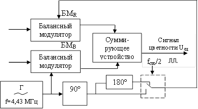 Составляющая поднесущей, которая модулируется «синим» цветоразностным сигналом, имеет постоянную фазу. Частота поднесущей выбрана равной fпц=4,43361815 МГц с учетом минимальной заметности этой поднесущей на окрашенных участках цветного изображения