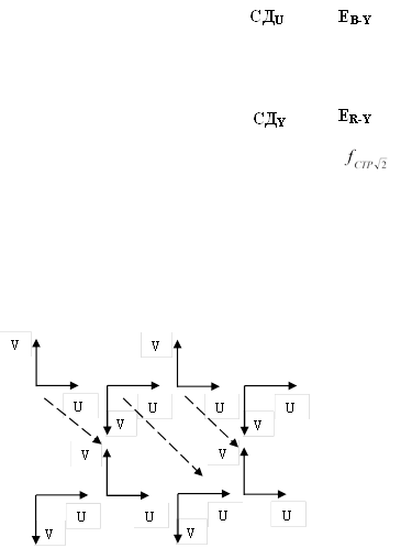 ) и от поля к полю. Фаза каждой поднесущей f0R и f0В коммутируется с частотой коммутации f ком = fстр/4.