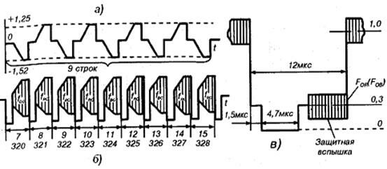 Сигналы цветовой синхронизации, например, представляют собой девять импульсов в форме усеченной трапеции с полярностью, изменяющейся от строки к строке (рисунок 5.9,а). Эти импульсы модулируют по частоте поднесущие цветности fOR и fOB, увеличивая в красных строках или уменьшая в синих строках их частоту (рисунок 5.9,б). Сигналы цветовой синхронизации передаются во время кадрового гасящего импульса КГИ в строках 7-15 и 320-328 (рисунок 5.9,б).